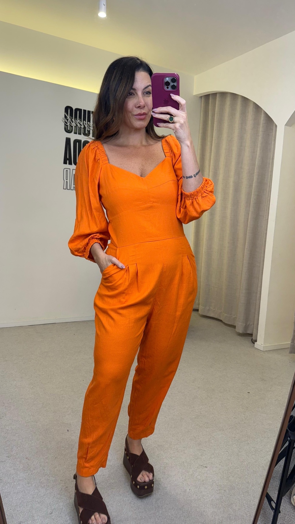 O Macacão em Linho, na cor laranja, da My Place é prático, pois conta com decote em coração, mangas 7/8 com modelagem bufante e calça estilo jogging, que dá um toque moderno à peça. Possui lastex nas costas e fechamento em zíper invisível. Está no tamanho G e veste melhor manequim 40/42.