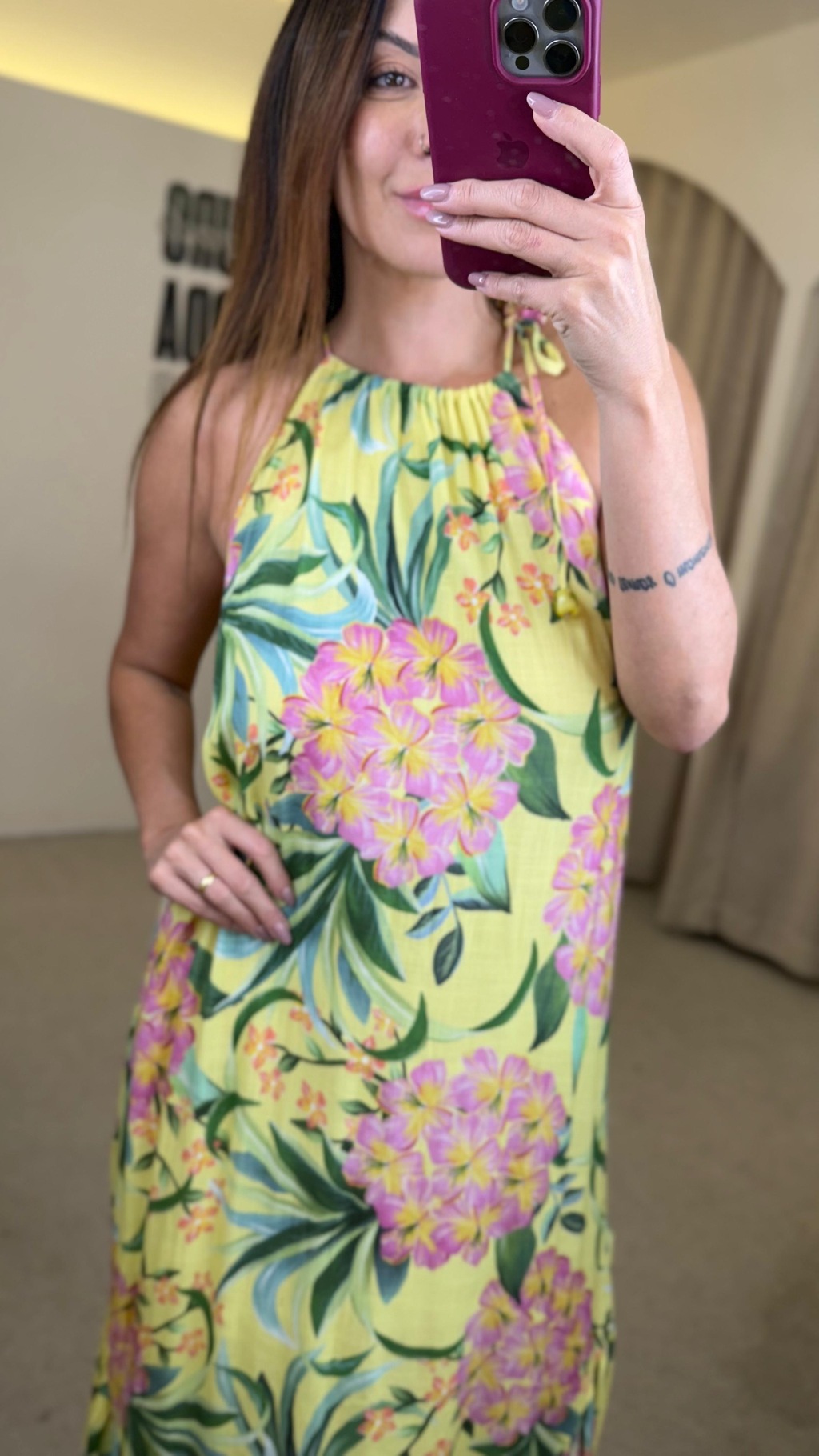 Vestido cropped abacaflor, amarelo estampado, com modelagem ampla e cava americana. Possui fenda lateral e alças para ajuste na gola.